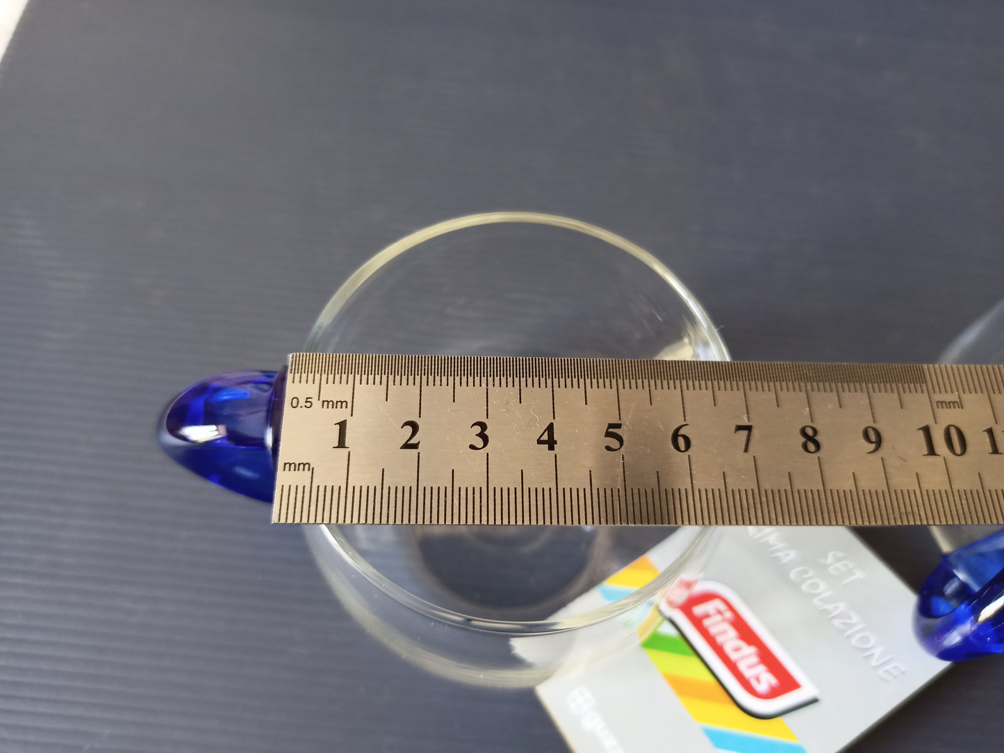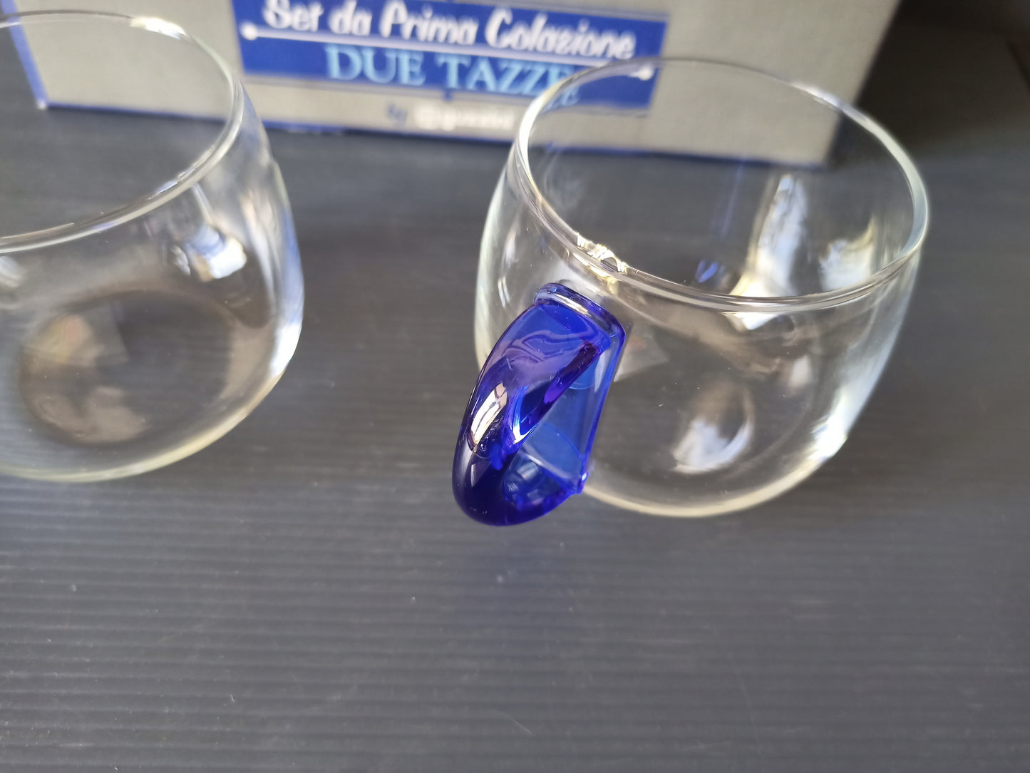 Tazza da caffè/thè in vetro con manico blu in plastica.